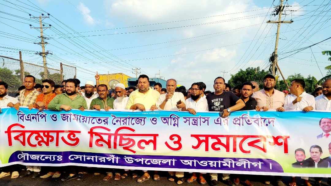 বিএনপির 'অগ্নিসন্ত্রাসের' বিরুদ্ধে আজ সোনারগাঁয়ে কাঁচপুরে প্রতিবাদ ও বিক্ষোভ সমাবেশের ডাক দিয়েছে সোনারগাঁও উপজেলা আওয়ামী লীগ। রবিবার (৩০ জুলাই) বিকেলে ঢাকা-চট্টগ্রাম মহাসড়কের কাঁচপুর এলাকায় বিএনপির 'অগ্নিসন্ত্রাসের' বিরুদ্ধে প্রতিবাদ ও বিক্ষোভ সমাবেশ করে সোনারগাঁও উপজেলা আওয়ামী লীগ। উক্ত বিক্ষোভ ও প্রতিবাদ মিছিলে উপস্থিত ছিলেন সোনারগাঁ উপজেলা যুবলীগের সভাপতি রফিকুল ইসলাম নান্নু, জামপুর ইউনিয়ন পরিষদের চেয়ারম্যান হুমায়ুন কবির ভুঁইয়া, সোনারগাঁ উপজেলা যুবলীগের যুগ্ম সাধারণ সম্পাদক লিটন খাঁন, সোনারগাঁ উপজেলা আওয়ামী লীগের শ্রমবিষয়ক সম্পাদক মো: আব্দুল মান্নান মেম্বার, সোনারগাঁ উপজেলা আওয়ামীলীগের সদস্য ও সাদিপুর ইউনিয়ন যুবলীগের সভাপতি মো: দেলোয়ার হোসেন, সোনারগাঁ উপজেলা যুবলীগের সহ-সভাপতি মতিউর রহমান, সোনারগাঁ উপজেলা ছাত্রলীগের সাংগঠনিক সম্পাদক ওয়াসিম প্রধান, সেচ্ছাসেবকলীগ নেতা আরিফুল ইসলাম রবিন, সোনারগাঁ উপজেলা সেচ্ছাসেবকলীগের সাধারণ সম্পাদক প্রার্থী মাসুম আহমেদ সহ সোনারগাঁ উপজেলা আওয়ামীলীগের সহযোগী সংগঠনের নেতাকর্মীরা।