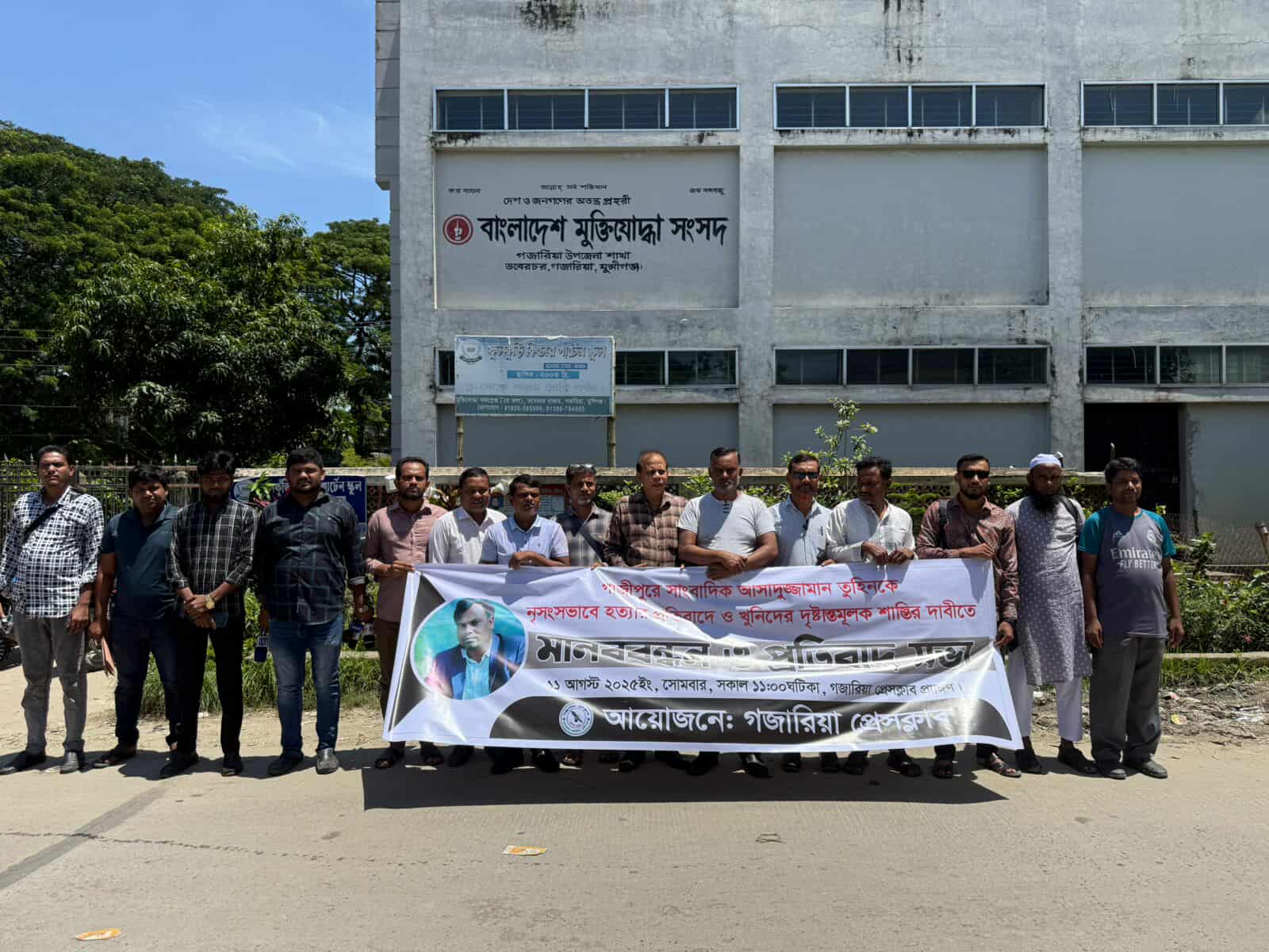 মুন্সীগঞ্জে গজারিয়া উপজেলা দৈনিক প্রতিদিনের কাগজের ষ্টাফ রিপোর্টার আসাদুজ্জামান তুহিনকে প্রকাশ্যে নৃশংসভাবে কুপিয়ে হত্যার প্রতিবাদে মানববন্ধন ও প্রতিবাদ সভা অনুষ্ঠিত হয়েছে।