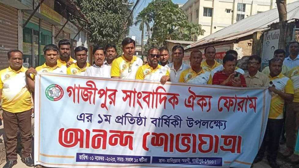 আনন্দমুখর পরিবেশে পালিত হলো গাজীপুর সাংবাদিক ঐক্য ফোরামের ১ম প্রতিষ্ঠা বার্ষিকী। বুধবার( ০১ নভেম্বর) সকালে হাবিবুল্লাহ সরণী রোড ইকবাল কুটিরের সামনে থেকে এক আনন্দ শুভাযাত্রা বের করা হয়। শুভাযাত্রাটি জয়দেবপুর রেলগেট এলাকা প্রদক্ষিণ করে পুলিশ সুপার কার্যালয় ঘুরে আবার হাবিবুল্লাহ্ স্মরণীতে এসে শেষ হয়। পরে আলোচনা শেষে কেক কেটে প্রতিষ্ঠা বার্ষিকী পালন করা হয়। এসময় প্রধান অতিথি হিসেবে উপস্থিত ছিলেন,বীর মুক্তিযোদ্ধা আবু হানিফ (প্যানেল চেয়ারম্যান গাজীপুর জেলা পরিষদ)। সভাপতি হিসেবে উপস্থিত ছিলেন, গাজীপুর সাংবাদিক ঐক্য ফোরামের সভাপতি মোঃ আকরাম হোসেন, সাধারণ সম্পাদক, মোঃ নজরুল ইসলাম আজাহার (সম্পাদক ও প্রকাশক দৈনিক বাংলাভূমি পত্রিকা), সহ সভাপতি মাজহারুল ইসলাম কাঞ্চন, যুগ্ম সাধারণ সম্পাদক তৌফিকুল ইসলাম, সাংগঠনিক সম্পাদক ইঞ্জি: মাসুদ রানা, দফতর সম্পাদক রেজাউল করিম মোল্লা, নির্বাহী সদস্য ফজলুল হক বাদল, নির্বাহী সদস্য শাহানাজ পাটোয়ারি, সদস্য দৈনিক কন্ঠবাণী পত্রিকার সম্পাদক ও প্রকাশক এম.জে আলম, সদস্য নুরুল ইসলাম সবুজ, সদস্য হাইউল উদ্দিন খান, সদস্য নাসির, সদস্য রশিদ মোল্লা, সদস্য আব্দুল আলী, রাকিব প্রমুখ।