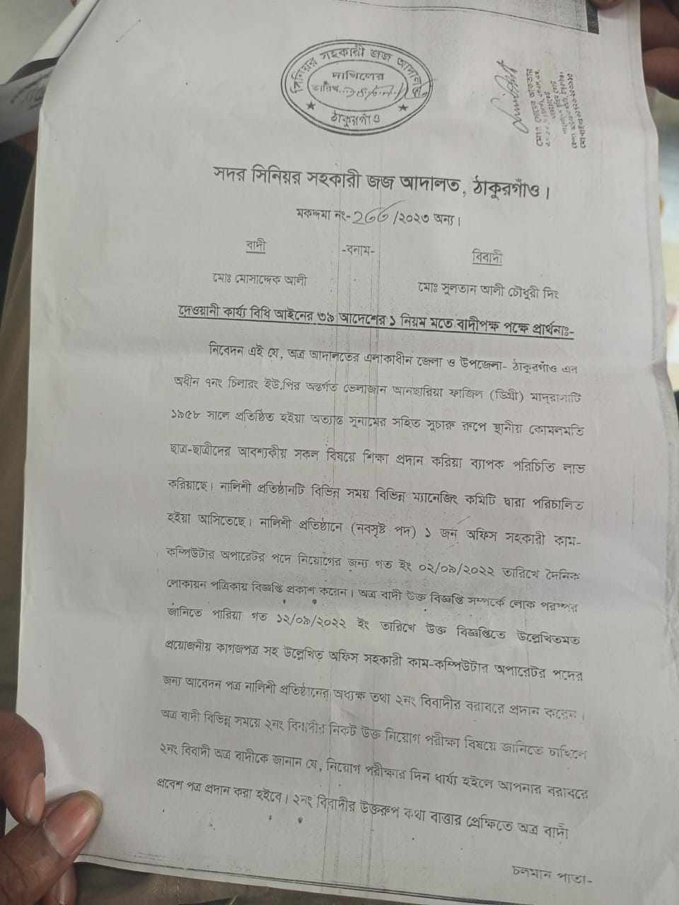 পরবর্তীতে গোপনে নিয়োগ দেওয়ার চেস্টা করলে মো: মোসাদ্দেক আলী নামে এক চাকুরী প্রার্থী নিয়োগ পরিক্ষায় অসচ্ছলতা ও স্বজনপ্রীতি হওয়ার আশঙ্কায় ওই মাদ্রাসার সভাপতি সুলতান আলী চৌধুরীসহ ১৭জনকে বিবাদী করে জেলার সিনিয়র সহকারী জজ আদালতে মোকাদ্দমা আনায়ন করে। মামলা নং ২৩৩/২০২৩। এতে নিয়োগ প্রক্রিয়া বন্ধ ছিলো।