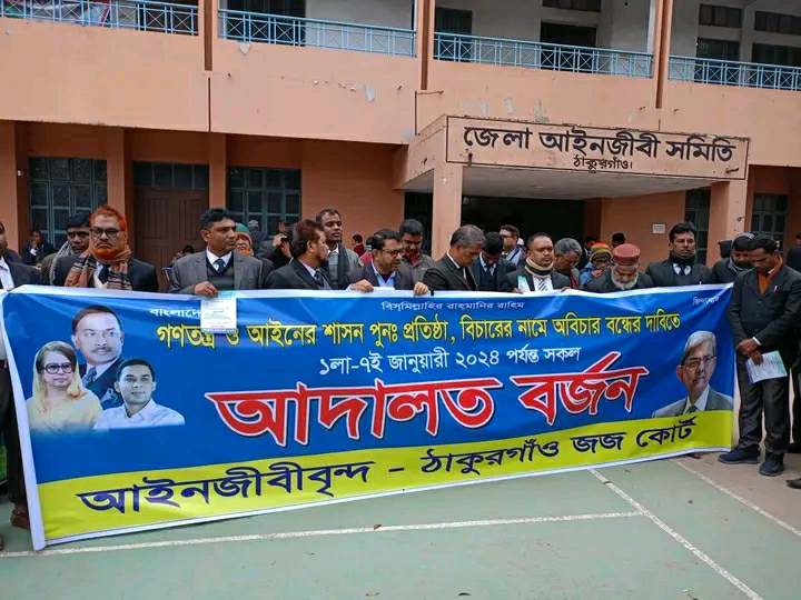 সোমবার (১ লা জানুয়ারি) দুপুরে ঠাকুরগাঁও জেলা আইনজীবী সমিতির সামনে এ কর্মসূচিতে বক্তব্য রাখেন ঠাকুরগাঁও জেলা আইনজীবী সমিতির সভাপতি অ্যাডভোকেট আব্দুল হালিম, সাধারণ সম্পাদক এ্যাড. জয়নাল আবেদীন সহ অন্যান্যরা।