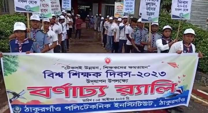 সভ্য জাতি গঠনে নৈতিক শিক্ষা ও আদর্শ শিক্ষকের বিকল্প নেই' এই প্রতিপাদ্যকে সামনে রেখে ঠাকুরগাঁওয়ে বিশ্ব শিক্ষক দিবস পালিত হয়েছে। দিবসটি উপলক্ষে বৃহস্পতিবার (৫ অক্টোবর) দুপুরে ঠাকুরগাঁও সরকারি টেকনিক্যাল স্কুল ও কলেজ থেকে একটি র্যালি বের হয়। র্যালিটি শহরের প্রধান সড়ক প্রদক্ষীণ শেষে পুনরায় ঠাকুরগাঁও সরকারি টেকনিক্যাল স্কুল ও কলেজ প্রাঙ্গনে এসে শেষ হয়। র্যালি শেষে এক আলোচনা সভা অনুষ্ঠিত হয়।