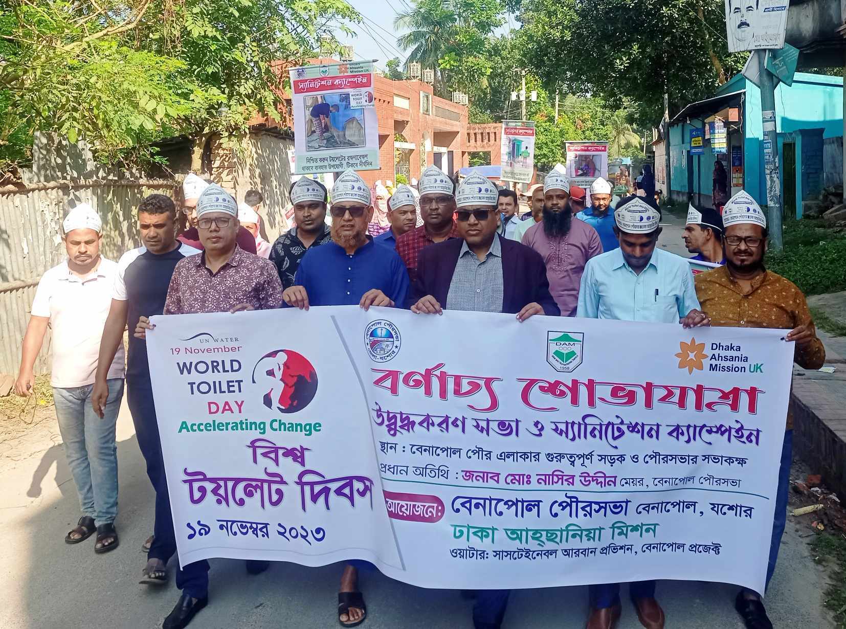 জাতিসংঘ কর্তৃক ঘোষিত “এক্সিলারেটিং চেঞ্জ তথা ত্বরান্বিত পরিবর্তন” প্রতিপাদ্যকে সামনে রেখে ঢাকা আহ্ছানিয়া মিশনের উদ্যোগে এবং বেনাপোল পৌরসভার সার্বিক ব্যবস্থাপনায় আজ ১৯ নভেম্বর বিভিন্ন কার্যক্রমের মধ্যে দিয়ে উদযাপিত হয় বিশ্ব টয়লেট দিবস ২০২৩। এ উপলক্ষ্যে একটি বর্ণাঢ্য শোভাযাত্রা বেনাপোল পৌরসভা থেকে শুরু হয়ে গুরুত্বপূর্ণ সড়ক প্রদক্ষিণ করে পূনরায় পৌরভবনের সামনে এসে শেষ হয়। শোভাযাত্রা শেষে বেনাপোল পৌরসভার হলরুমে উদ্বুদ্ধকরণ সভা অনুষ্ঠিত হয়। টয়েলেট দিবসের এসব কর্মসূচিতে প্রধান অতিথি হিসেবে উপস্থিত ছিলেন বেনাপোল পৌরসভার মেয়র মোঃ নাসির উদ্দীন। বিশেষ অতিথি হিসেবে উপস্থিত ছিলেন বেনাপোল পৌরসভার নির্বাহী প্রকৌশলী মোঃ মোশারফ হোসেন। বেনাপোল পৌরসভার হিসাব রক্ষণ কর্মকর্তা মো: জাহাঙ্গীর হোসেন ও অন্যান্যা স্টাফবৃন্দ, কমিউনিটি প্রতিনিধিবৃন্দ এবং ঢাকা আহ্ছানিয়া মিশনের কর্মকর্তা, কমিউনিটি মোবিলাইজার ও মাঠকর্মীবৃন্দ।