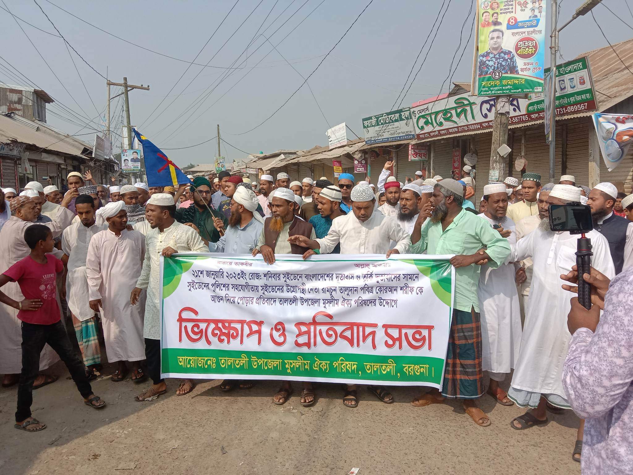 আজ শুক্রবার (২৭ জানুয়ারি ২০২৩) জুমার নামাজের পরে তালতলীর বিভিন্ন মসজিদের মুসল্লী ও ধর্মপ্রাণ প্রিয় মুসলিম জনতা একত্রিত হয়ে উপজেলার প্রধান প্রধান সড়কে মুসলিম ঐক্য পরিষদের মাধ্যমে অংশগ্রহণ করেন। রেলি শেষে তালতলী সদর রোডে আলোচনা সভা অনুষ্ঠিত হয়। এতে বক্তব্য দেন, ইসলামী আন্দোলন বাংলাদেশ তালতলী উপজেলা শাখার সভাপতি মাও. আফজাল হোসেন, তালতলী মদিনা জামে মসজিদের ইমাম ও খতিব মুফতি মোহাম্মদ ইসমাইল বিন হুসাইন, ছোট ভাইজোড়া আলিম মাদ্রাসার উপাধ্যক্ষ মাও. আবুল কালাম আজাদ প্রমুখ।