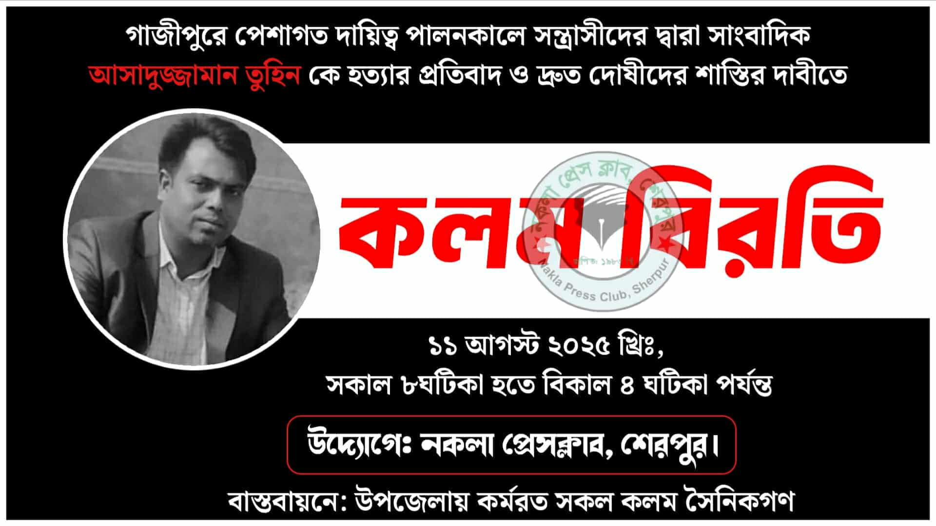 গাজীপুরে সাংবাদিক আসাদুজ্জামান তুহিনকে প্রকাশ্যে কুপিয়ে হত্যার প্রতিবাদে এবং ঘটনায় জড়িতদের দৃষ্টান্তমূলক শাস্তির দাবিতে কলম বিরতিসহ বিভিন্ন কর্মসূচির ঘোষণা দিয়েছে শেরপুরের নকলা প্রেসক্লাবসহ উপজেলায় কর্মরত সাংবাদিক সমাজ। একই সঙ্গে সাংবাদিক দম্পতি সাগর-রুনিসহ দেশের সব সাংবাদিক হত্যার সুষ্ঠু বিচারের দাবিতে কঠোর কর্মসূচির হুঁশিয়ারি দিয়েছেন তারা।