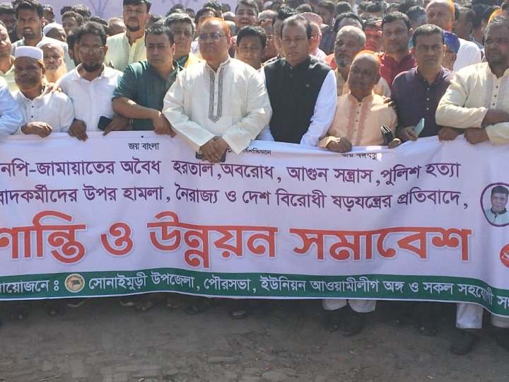 সোমবার সকালে সোনাইমুড়ী বাইপাস সত্তর নোয়াখালী-১ আসন থেকে আওয়ামীলীগ থেকে মনোনয়ন প্রার্থী ও প্রধানমন্ত্রীর ব্যক্তিগত সহকারী আলহাজ্ব জাহাঙ্গীর আলম এর নেতৃত্বে একটি শান্তি মিছিল বের হয়। মিছিলটি সোনাইমুড়ী বাজারের প্রধান প্রধান সড়ক প্রদক্ষিণ করে একইস্থানে এসে শেষ হয় পরে শান্তি সমাবেশ অনুষ্ঠিত হয়।