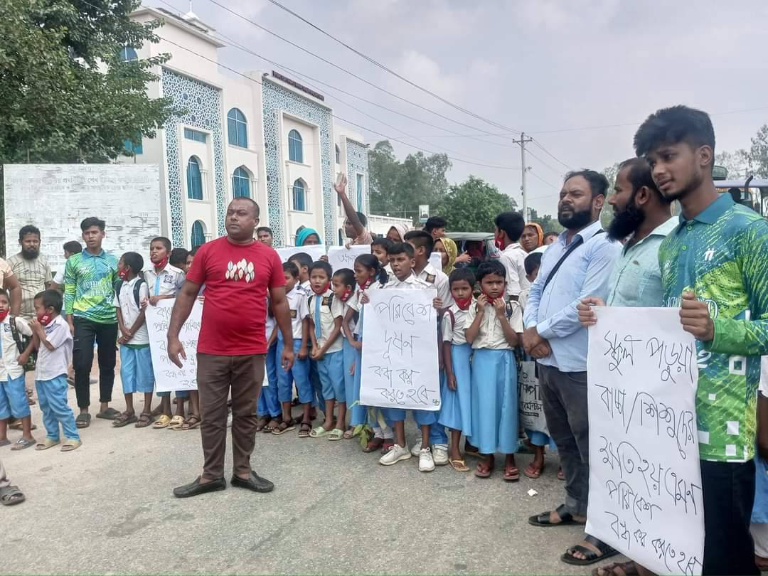 মানববন্ধনে নগরকুমারী সরকারি প্রাথমিক বিদ্যালয়ের সভাপতি শেখ আবুল হোসেন শিলন, সমাজ সেবক মো. ইউছুফ আলী, সামিউল ইসলামসহ স্থানীয়রা বক্তব্য রাখেন।