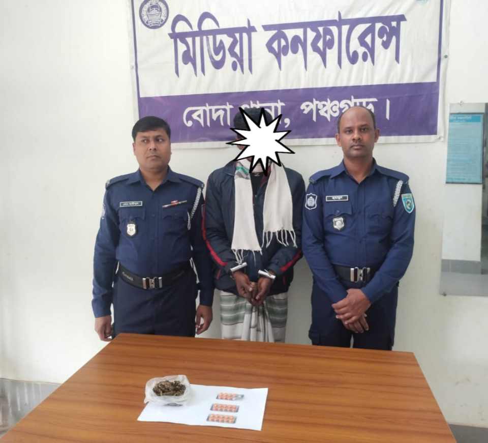 পুলিশ জানায়, বোদা থানার অফিসার ইনচার্জ মোঃ মোজাম্মেল হকের নেতৃত্বে এসআই আব্দুস সালাম, এসআই বদিউজ্জামান, এএসআই সাজেদুর, এএসআই সোহেল রানা ও সঙ্গীয় ফোর্স বিশেষ অভিযান পরিচালনা কালে উপজেলার চন্দনবাড়ী ইউপিনের কুমপুকরী গ্রামের জান্নাত ফিলিং স্টেশনের সামনে থেকে ৪০ গ্রাম গাঁজা ও ২৭ পিচ ট্যাপেন্টাডল ট্যাবলেটসহ হাতে নাতে তাকে আটক করে। আটক কৃত মোঃ সুমন ইসলাম সাকোয়া ছাত্রশিকারপুর গ্রামের মৃত মোজাম্মেল হকের ছেলে।