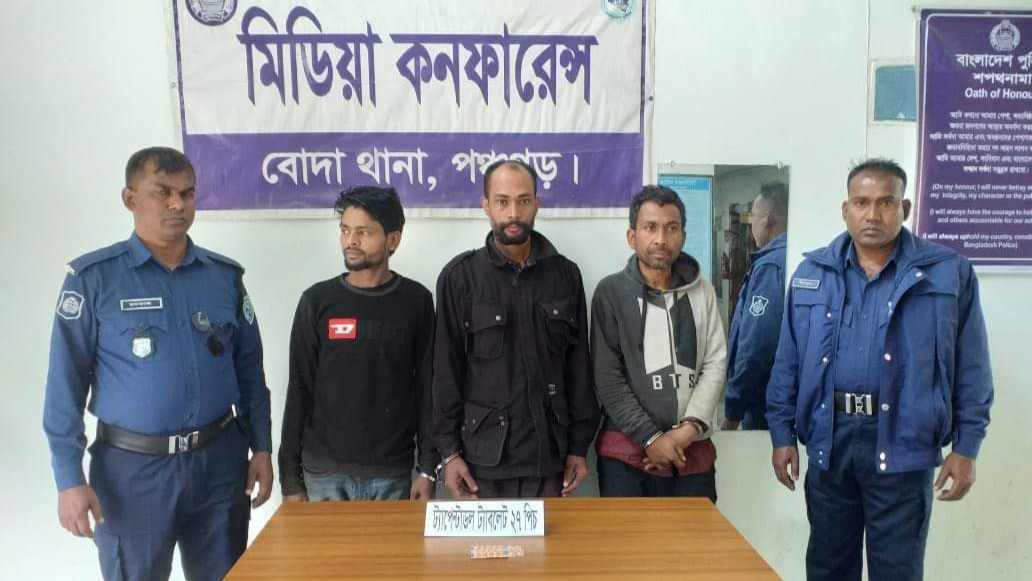 পঞ্চগড়ের বোদায় মাদকসহ শাহেরুল ইসলাম (৪০), সাজ্জাদ হোসেন (৩০) এবং মমিনুল ইসলাম (২৯) নামের ৩ মাদক ব্যবসায়িকে আটক করেছে বোদা থানা পুলিশ। গত শুক্রবার দিবাগত রাতে বোদা পৌর শহরের পরিত্যক্ত দুই তলা কাঠের বাড়ি থেকে তাদের আটক করা হয়।