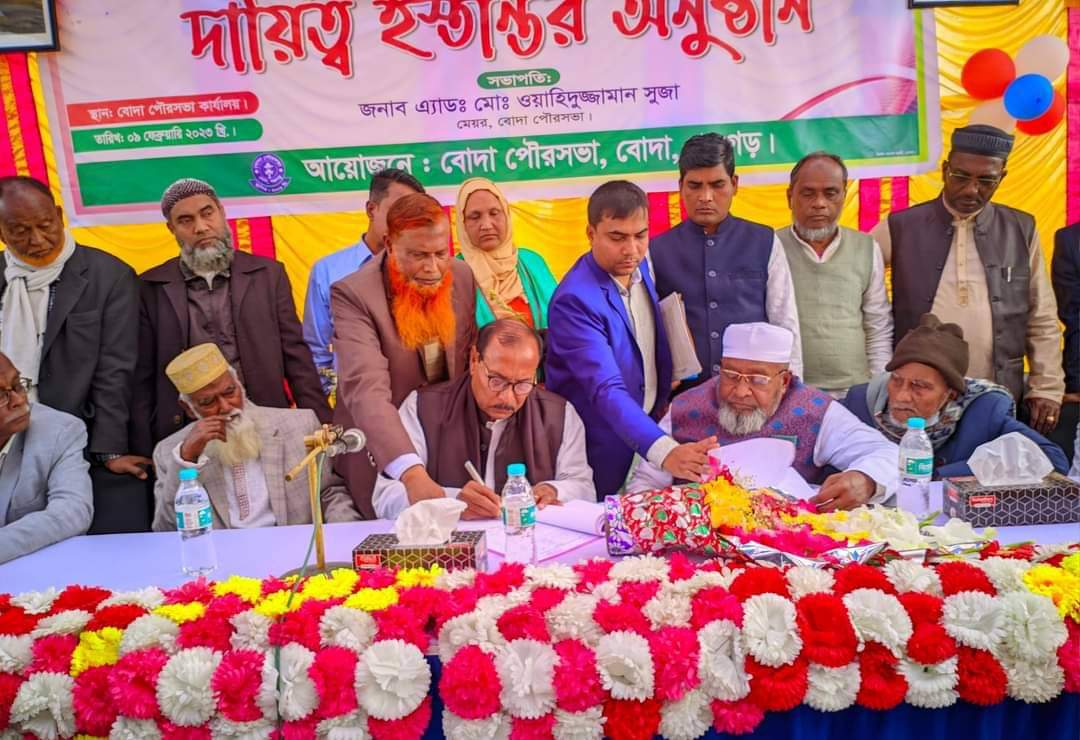 পঞ্চগড়ের বোদা পৌরসভার নবনির্বাচিত মেয়র মো. আজহার আলী দায়িত্ব নিয়েছেন। গতকাল বৃহস্পতিবার সকালে বোদা পৌরসভা চত্বরে বিদায়ী মেয়র এড. ওয়াহিদুজ্জামান সুজার সভাপতিত্বে দায়িত্ব হস্তান্তর অনুষ্ঠান অনুষ্ঠিত হয়।