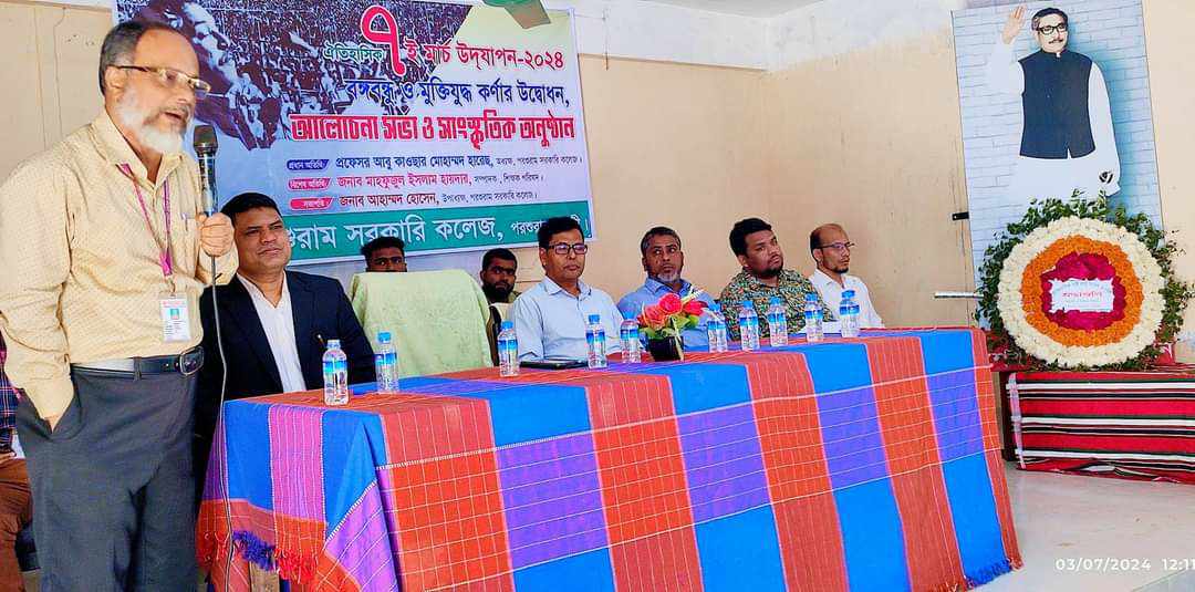 জহিরুল ইসলামের উপস্থাপনায় আলোচনা সভা ও সাংস্কৃতিক অনুষ্ঠানে সভাপতি হিসাবে উপস্থিত ছিলেন পরশুরাম সরকারি কলেজের উপাধ্যক্ষ জনাব আহাম্মদ হোসেন।