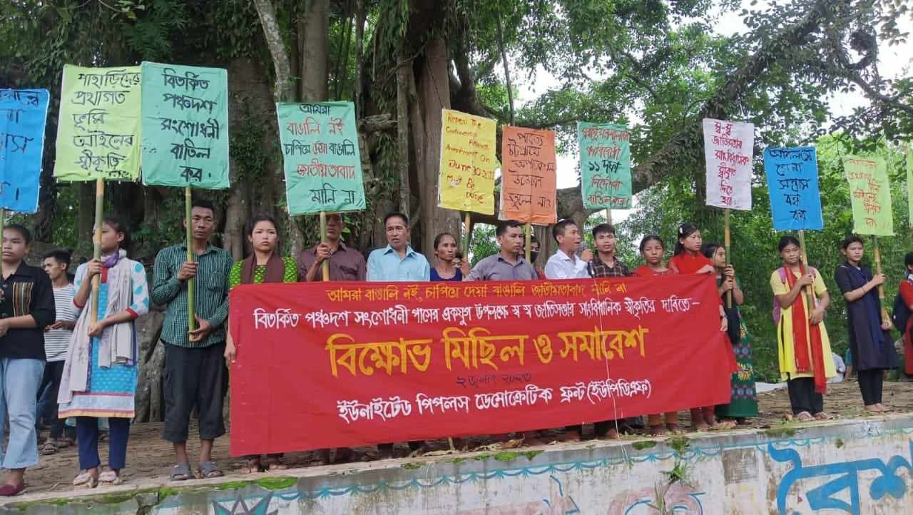 আমরা বাঙ্গালি নই, চাপিয়ে দেয়া বাঙ্গালি জাতীয়তাবাদ মানি না', 'বির্তকিত পঞ্চদশ সংশোধনী বাতিল পুর্বক স্ব স্ব জাতিস্বত্তার সাংবিধানিক স্বীকৃতি দিতে হবে।
