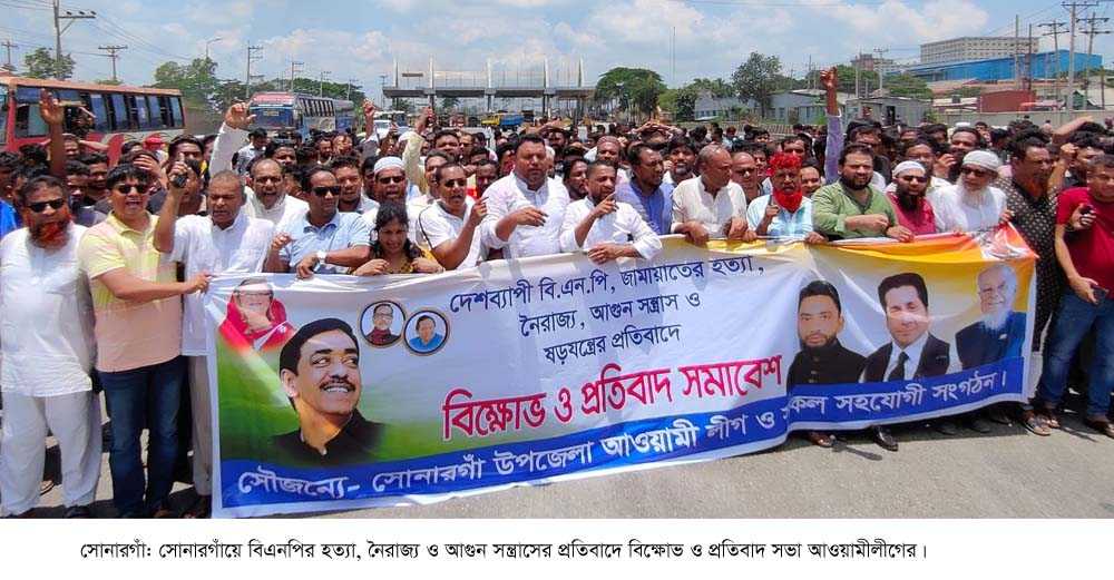 নারায়ণগঞ্জের সোনারগাঁয়ে বিএনপি জামায়াতের হত্যা, নৈরাজ্য ও আগুন সন্ত্রাসের প্রতিবাদে বিক্ষোভ ও প্রতিবাদ সভা করেছেন সোনারগাঁ উপজেলা আওয়ামী লীগ ও তার অঙ্গ সংগঠনের নেতাকর্মীরা। রোববার সকালে ঢাকা-চট্টগ্রাম-সিলেট মহাসড়কের মেঘনাঘাট এলাকায় এ বিক্ষোভ ও প্রতিবাদ সভা অনুষ্ঠিত হয়। সোনারগাঁ উপজেলা আওয়ামীলীগের সিনিয়র সহ সভাপতি ও পিরোজপুর ইউনিয়নের চেয়ারম্যান ইঞ্জিনিয়ার মাসুদুর রহমান মাসুমের নেতৃত্বে বিক্ষোভ মিছিলে উপস্থিত ছিলেন, সোনারগাঁ উপজেলা আওয়ামীলীগের যুগ্ম সম্পাদক আশরাফুজ্জামান, রফিকুল ইসলাম নান্নু, সাংগঠনিক সম্পাদক সোহাগ রনি, সনমান্দি ইউনিয়ন পরিষদের চেয়ারম্যান জাহিদ হাসান জিন্নাহ, পিরোজপুর ইউনিয়ন আওয়ামীলীগের আহবায়ক ফিরোজ্জামান মোল্লা, যুগ্ম আহবায়ক ডা. আতিকুল্লাহ, আতাউর রহমান আক্তার, মুক্তিযোদ্ধা সোহেল রানা, ওসমান গনি, সোনারগাঁ উপজেলা যুবলীগের সাংগঠনিক সম্পাদক আবু সাইদ, আরিফ আহমেদসহ যুবলীগ, ছাত্রলীগ, স্বেচ্ছাসেবকলীগ ও অঙ্গ সংগঠনের নেতাকর্মীরা উপস্থিত ছিলেন। বিক্ষোভ মিছিলটি ঢাকা চট্টগ্রাম মহাসড়ক প্রদক্ষিণ করে। এর আগে পিরোজপুর ইউনিয়ন আওয়ামীলীগ কার্যালয়ের সামনের প্রতিবাদ সভা করে আওয়ামীলীগের নেতাকর্মীরা।
