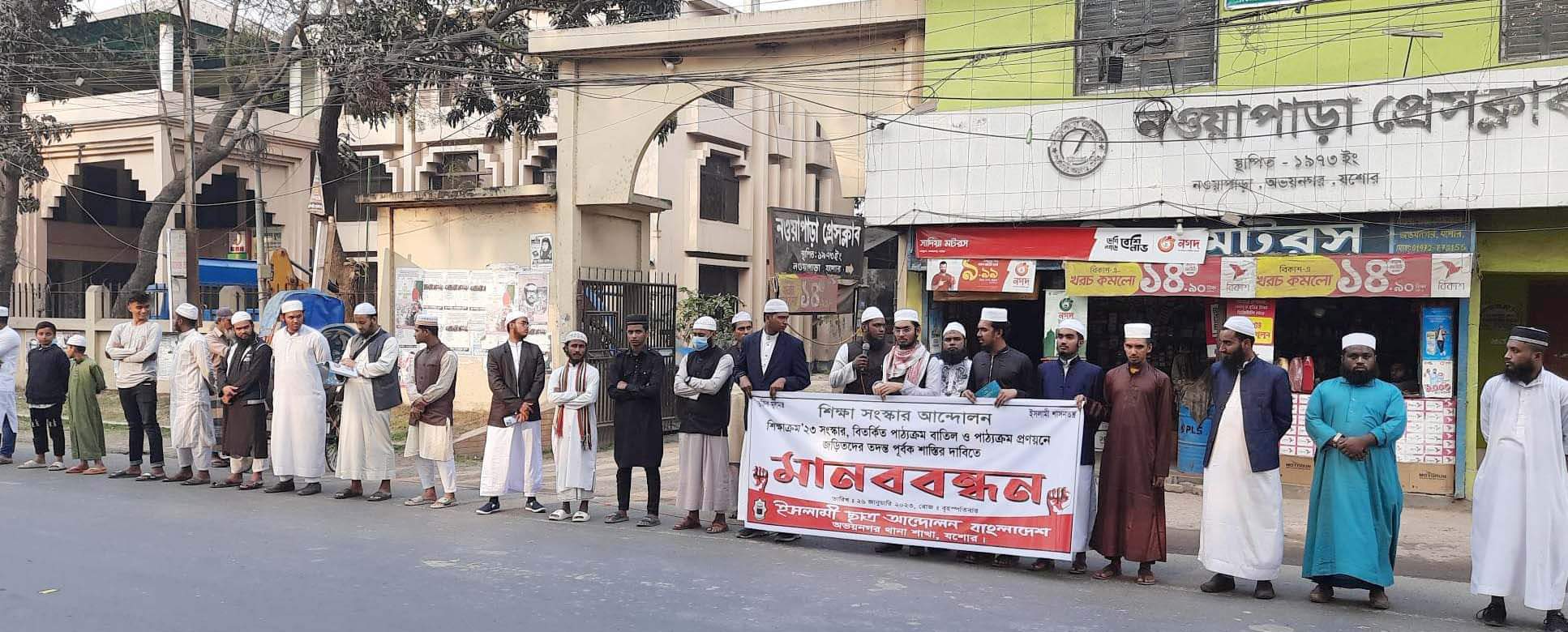 বিতর্কিত পাঠ্যক্রম বাতিল ও পাঠ্যক্রম প্রণয়নে জড়িতদের শাস্তির দাবিতে যশোরের অভয়নগরে মানবন্ধন অনুষ্ঠিত হয়েছে। ইসলামী ছাত্র আন্দোলন বাংলাদেশ অভয়নগর উপজেলা শাখা এ মানববন্ধনের আয়োজন করে। বৃহস্পতিবার (২৬ জানুয়ারি) বিকালে নওয়াপাড়া প্রেস ক্লাবের সামনে মাদরাসা ছাত্ররা এ মানববন্ধনে অংশগ্রহণ করে। ঘন্টাব্যাপী চলা মানববন্ধনে বক্তব্য রাখেন, ইসলামী ছাত্র আন্দোলন যশোর জেলা শাখার সাধারণ সম্পাদক ফয়েজ গাজী, অভয়নগর উপজেলা শাখার সভাপতি ওহিদুল ইসলাম, সহ-সভাপতি তাওহিদুল ইসলাম ও সাবেক সভাপতি আশরাফুল ইসলাম। এসময় ২০২৩ শিক্ষাক্রমে বিতর্কিত পাঠ্যক্রম বাতিল ও পাঠ্যক্রম প্রণয়নে জািড়তদের তদন্তপূর্বক শস্তির দাবি করেন বক্তারা। অন্যথায় কঠোর আন্দোলনের মধ্যদিয়ে সরকার পতনের হুশিয়ারী প্রদান করেন তারা। মানববন্ধন শেষে দোয়া অনুষ্ঠিত হয়। পরে ইসলামী ছাত্র আন্দোলনের প্রতিনিধি দল উপজেলা মাধ্যমিক শিক্ষা কর্মকর্তা শহিদুল ইসলাম বরাবর স্মারকলিপি প্রদান করে।