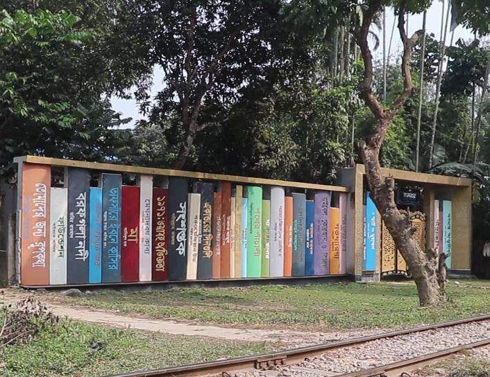 দূর থেকে দেখে মনে হবে স্তরে স্তরে সাজানো বুক-সেল্ফ, কিন্তু কাছে গিয়ে দেখলে সেই ভূল ভাঙ্গবে, আসলে এটি বুক-সেল্ফের আদলে তৈরী করা একটি বাড়ির সীমানা প্রাচীর যেখানে স্থান পেয়েছে বঙ্গবন্ধুর অসমাপ্ত আত্মজীবনী, মাইকেল মধুসূদন দত্তের মেঘনাদবধ কাব্য, রবীন্দ্রনাথ ঠাকুরের গীতাঞ্জলি, কাজী নজরুল ইসলাম এর অগ্নিবীণা সহ অনেক বরেণ্য লেখকদের বই এর মোড়ক ।