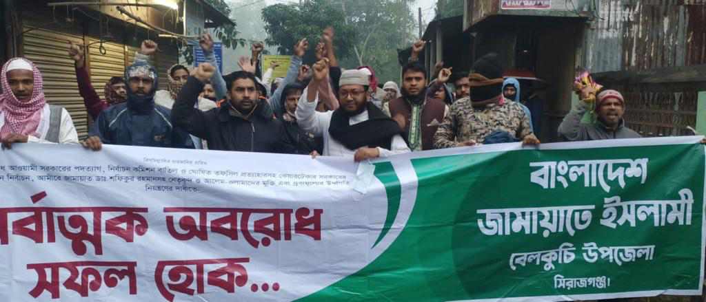 কেন্দ্র ঘোষিত ১০ম দফায় ৪৮ ঘন্টার অবরোধ কর্মসূচী'র শেষ দিবসে-ফ্যাসিস্ট আওয়ামী সরকারের পদত্যাগ,নির্বাচন কমিশন বাতিল ও ঘোষিত তফসিল প্রত্যাহারসহ কেয়ারটেকার সরকার ব্যবস্থা প্রতিষ্ঠা,আমীরে জামায়াত ডাঃ শফিকুর রহমানসহ নেতৃবৃন্দ ও আলেম-উলামাদের মুক্তি এবং নিত্য প্রয়োজনীয় দ্রব্যমূল্যের উর্দ্ধগতিরোধের দাবীতে- বাংলাদেশ জামায়াতে ইসলামী'র পক্ষ থেকে ঘোষিত ২'দিনের সড়ক,নৌ এবং রেলপথ অবরোধ কর্মসূচি'র অংশ হিসেবে সিরাজগঞ্জের বেলকুচিতে সড়ক অবরোধ করে জামায়াত-শিবিরের নেতা-কর্মীরা।