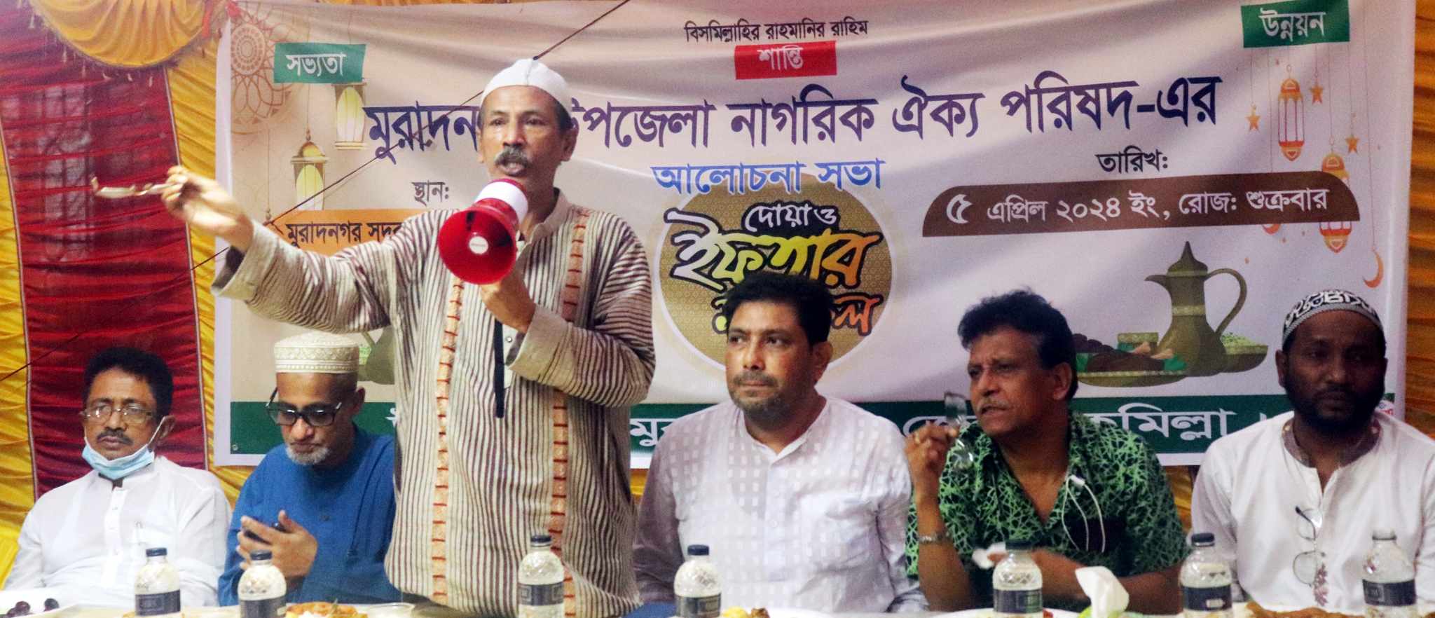 কুমিল্লার মুরাদনগর উপজেলাশ নাগরিক ঐক্য পরিষদের আলোচনা সভা, দোয়া ও ইফতার মহফিল অনুষ্ঠিত হয়েছে। শুক্রবার সন্ধ্যায় মুরাদনগর সদর ইউনিয়নের সাবেক চেয়ারম্যান মোস্তাক আহমেদ মাসুদের বাসবভনে ওই ইফতার মহফিলটি অনুষ্ঠিত হয়। অধ্যাপক সাইফুল আলম মামুনের সভাপতিত্বে অনুষ্ঠানে বক্তব্য রাখেন, নাগরিক ঐক্যের কার্যকরি পরিষদের সভাপতি তারেক আব্দুল্লাহ, সহ-সভাপতি অ্যাডভোকেট আতিক উল্লাহ, সাধারন সম্পাদক অ্যাডভোকেট মাহমুদুল্লাহ পলাশ, সাংগঠনিক সম্পাদক বশির আহমেদ। যুগ্ম সাধারণ সম্পাদক হুমায়ুন কবীর খানের উপস্থাপনায় অনুষ্ঠানে অন্যান্যের মধ্যে আরো উপস্থিত ছিলেন, মোস্তাক আহমেদ মাসুদ, পার্থ সারথী দত্ত, হাবিবুর রহমান, মোস্তফা কামাল, আক্তার হোসেন মেম্বার, আশরাফুল ইসলাম মেম্বার ও আব্দুর রহিম প্রমুখ। ইফতার পূর্বে দেশ ও জাতির শান্তি কামনায় দোয়া পরিচালনা করেন, মাওলানা ইয়াকুব আলী।