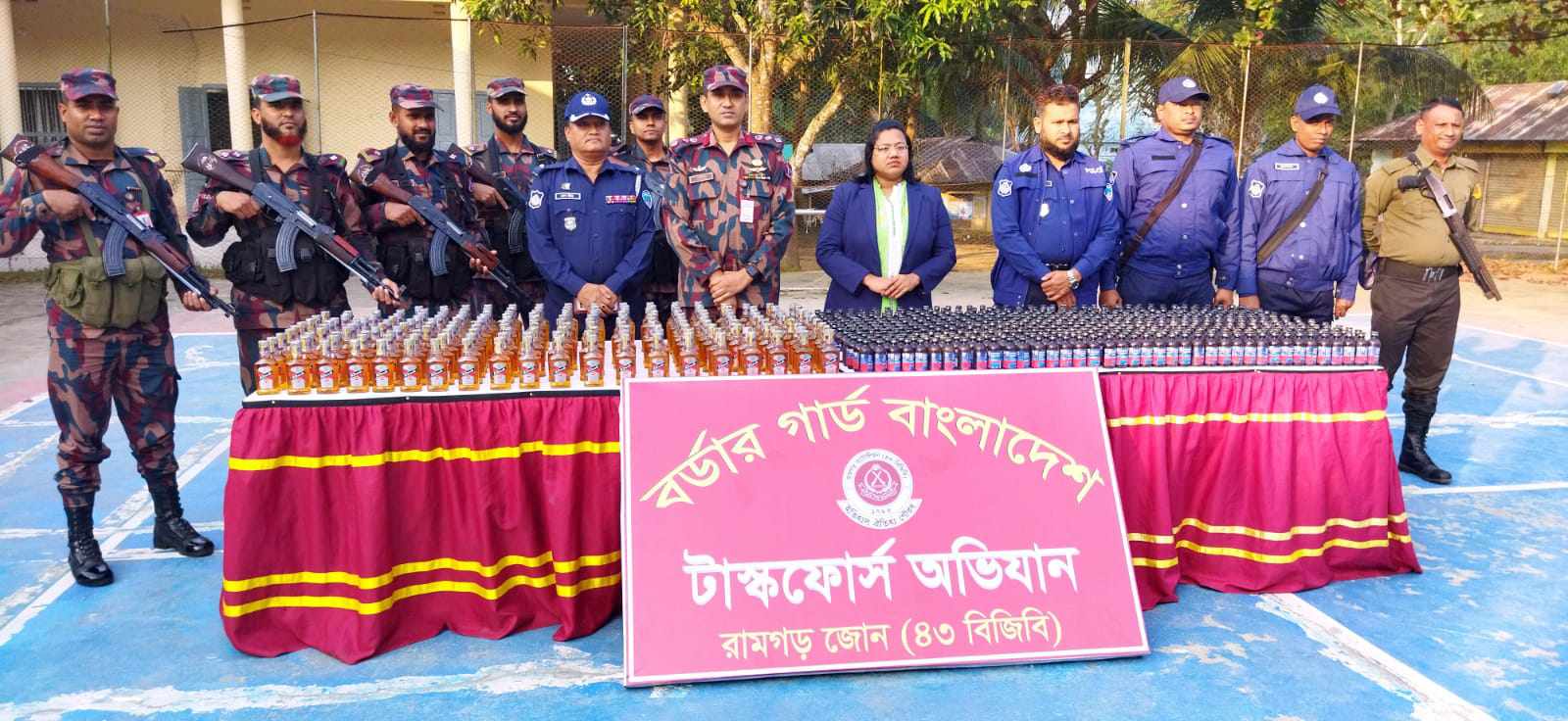 শ্রুক্রবার(২২ ডিসেম্বর) ভোর রাতে রামগড় ৪৩ বিজিবির অধিনায়ক লে.কর্ণেল আবু বকর সিদ্দিক সাইমুম এর নেতৃত্বে উপজেলা নির্বাহী অফিসার মিস.মমতা আফরিন ও থানার ওসি দেব প্রিয় দাস এর সমন্বয়ে গঠিত টাস্কফোর্স কমিটির বিশেষ অভিযানে মদ ও ফেনসিডিল জব্দ করা হয়। গোপন সংবাদের ভিত্তিতে মন্দির ঘাট এলাকায় অভিযান চালায় টাস্কফোর্স টিম। এসময় টাস্কফোর্সের উপস্থিতি টের পেয়ে মালামাল রেখে চোরাকারবারীরা পালিয়ে যায়। এরপর মালিকবিহীন ১৯২ বোতল মদ ও ৪৯৮ বোতল ফেনসিডিল জব্দ করা হয়,যার সর্বমোট আনুমানিক বাজারমূল্য ৪ লক্ষ ৮৭ হাজার তিনশত টাকা। মদ ও ফেনসিডিল ধ্বংস করার জন্য বিজিবির ব্যাটালিয়ন সদর দপ্তরে জমা রাখা হয়েছে। রামগড় উপজেলা নির্বাহী অফিসার মিস. মমতা আফরিন জানান, টাস্কফোর্সের মাদকবিরোধী অভিযান নিয়মিত চলবে। ভবিষ্যতে রামগড় কে মাদকমুক্ত করতে সকলের সহযোগিতা কামনা করছি।