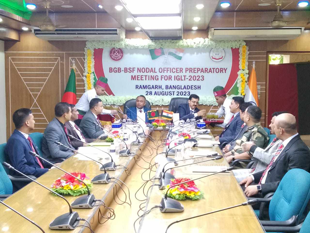 মোঃমাসুদ রানা, রামগড়(খাগড়াছড়ি)প্রতিনিধিঃ খাগড়াছড়ির রামগড়ে বিজিবি-বিএসএফ সমন্বয় বৈঠক অনুষ্ঠিত হয়েছে।সোমবার ২৮ আগস্ট বিকাল ৫টা হতে সন্ধ্যা ৭ টা পর্যন্ত রামগড় ৪৩ বিজিবি অধীনস্থ রামগড় বিওপির দায়িত্বপূর্ণ সীমান্ত পিলার ২২১৫/৬ আরবি হতে ৩৫০গজ দক্ষিন দিকে রামগড় পৌরসভা ভবনে বিজিবির আহ্বানে নোডাল অফিসার পর্যায়ে, অগামি (১১-১৪ সেপ্টেম্বর ২০২৩ ইং)পর্যন্ত, চট্টগ্রাম রিজিয়ন সদরে অনুষ্ঠিতব্য বিজিবি রিজিয়ন কমান্ডার ও আইজি বিএসএফ পর্যায়ে সম্মেলনকে কেন্দ্র করে পয়েন্ট সমুহ নিয়ে অলোচনা সভা অনুষ্ঠিত হয়, উক্ত আলোচনা সভায় বিজিবির পক্ষে নেতৃত্ব দেন চট্টগ্রাম রিজিয়নের পরিচালক অপারেশন (নোডাল অফিসার)লেঃ কর্নেল এসএম শফিকুর রহমান পিএসসি জি+ স্যার এবং বিএসএফের পক্ষে নেতৃত্ব দেন ডিআইজি শ্রী অশোক কুমার ফ্রন্টিয়ার মিজোরাম এন্ড কাচার(নোডাল অফিসার)। শান্তিপূর্ণভাবে সমন্বয় সভা শেষে হয়েছে।