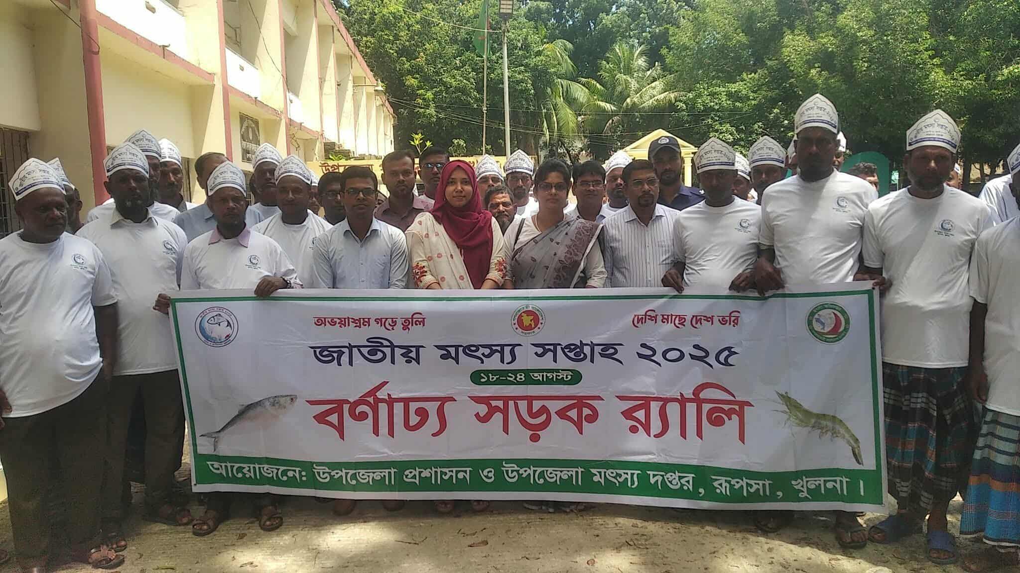 আঃ মান্নান (রূপসা প্রতিনিধি) : "অভয়াশ্রম গড়ে তুলি দেশি মাছে দেশ ভরি" এই স্লোগান নিয়ে রূপসা উপজেলা প্রশাসন ও মৎস্য দপ্তরের আয়োজনে জাতীয় মৎস্য সপ্তাহের উদ্বোধনী অনুষ্ঠান,মৎস্য পোনা অবমুক্তকরন, আলোচনা সভা ও বণার্ঢ্য শোভাযাত্রা আজ ১৮ আগষ্ট সকালে অফিসার্স ক্লাবে অনুষ্ঠিত হয়।শোভাযাত্রাটি উপজেলা পরিষদ চত্বর থেকে শুরু হয়ে অফিসার্স ক্লাব প্রাঙ্গণে শেষ হয়।