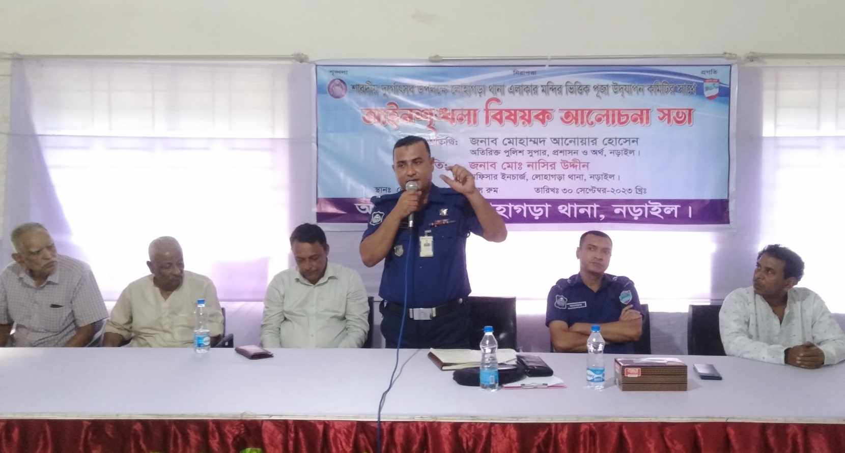 শনিবার ( ৩০ সেপ্টেম্বর) বিকাল সাড়ে ৩ টায় লোহাগড়া থানা পুলিশ প্রশাসনের আয়োজনে হলরুমে থানার অফিসার ইনচার্জ (ওসি) মো: নাসির উদ্দিনের সভাপতিত্বে ও উপজেলা পূজা উদযাপন পরিষদের আহবায়ক পরীক্ষিত সিকদারের সঞ্চালনায় আলোচনা সভায় প্রধান অতিথি হিসেবে বক্তব্য রাখেন নড়াইল জেলার অতিরিক্ত পুলিশ সুপার মো:আনোয়ার হোসেন।