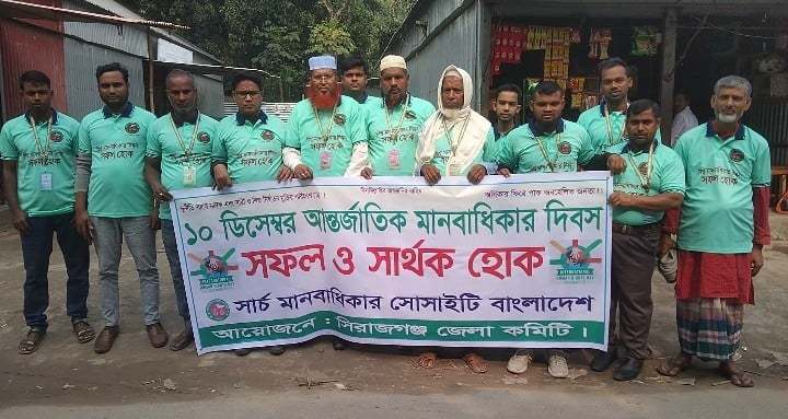 দুর্নীতি সন্ত্রাস মাদক এবং নারী ও শিশু নির্যাতন মুক্তির পরিবেশ চাই, অধিকার ফিরিয়ে পাক অবহেলিত জনতা, এই স্লোগান কে সামনে রেখে সিরাজগঞ্জে সার্চ মানবাধিকার সোসাইটি বাংলাদেশ সিরাজগঞ্জ জেলা কমিটির এর পক্ষে থেকে আন্তর্জাতিক মানবাধিকার দিবস পালন করা হয়। উক্ত দিবসে সভাপতি হিসাবে উপস্থিত ছিলেন, আলহাজ্ব মোঃ আইয়ুব আলী সভাপতি সার্চ মানবাধিকার সোসাইটি বাংলাদেশ সিরাজগঞ্জ জেলা কমিটি। এই সময়ে আরো উপস্থিত ছিলেন, উক্ত সংগঠনের জেলা শাখার সাধারণ সম্পাদক মোঃ শহিদুল ইসলাম খান, সহ সভাপতি মোঃ রেজাউল করিম, সাংগঠনিক সম্পাদক মো: সোহরাওয়ার্দী হোসেন, সহঃ সাধারণ সম্পাদক মোঃ রাশেদুল ইসলাম, সহঃ সাংগঠনিক বুদ্দু শেখ, ভুমি বিষয়ক সম্পাদক আলহাজ্ব মোঃ মোতালেব হোসেন, শিক্ষা বিষয়ক সম্পাদক মোঃ শাহিন রেজা, শ্রম বিষয়ক সম্পাদক মোঃ সেলিম রেজ, স্বাস্থ্য বিষয়ক সম্পাদক মোঃ ফেরদৌস, সহঃ কোষাদক্ষ আমিরুল ইসলাম , আন্তর্জাতিক বিষয়ক সম্পাদক রঞ্জু সরকার, যুব ও ক্রীড়া বিষয়ক সম্পাদক নুর আলম,