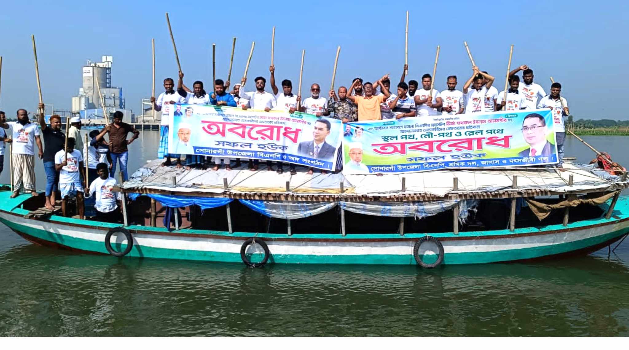 নারায়ণগঞ্জের সোনারগাঁয়ের মেঘনা নদীতে নৌপথ অবরোধ করেছে নারায়ণগঞ্জ জেলা যুবদলের নেতাকর্মীরা। গতকাল বৃহস্পতিবার সকালে সোনারগাঁয়ের বারদী ও আনন্দবাজার এলাকায় মেঘনা নদীতে একটি ট্রলারে চড়ে জেলা যুবদলের নেতাকর্মীরা এ অবরোধ কর্মসূচী পালন করেন। এছাড়াও এশিয়ান হাইওয়ের সড়কের মরিচটেক এলাকায় ছাত্র দলের নেতাকর্মীরা সড়কে আগুন জ্বেলে অবরোধ কর্মসূচী পালন করে।