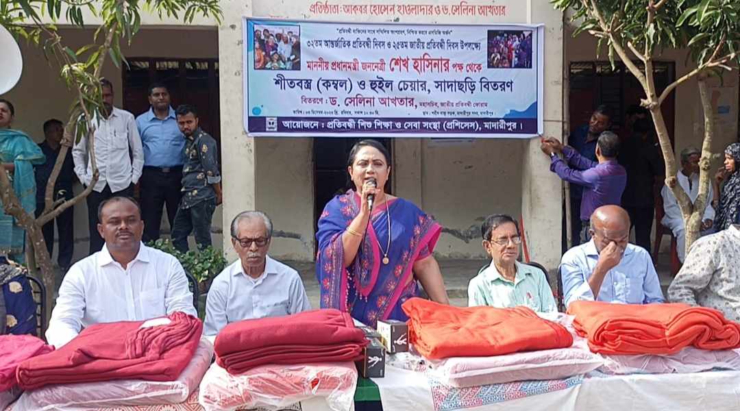 মাদারীপুরে ৩২তম আন্তর্জাতিক প্রতিবন্ধী দিবস ও ২৫তম জাতীয় প্রতিবন্ধী দিবস উপলক্ষে শেখ হাসিনার পক্ষ থেকে শীতবস্ত্র (কম্বল) ও হুইল চেয়ার, সাদাছড়ি বিতরণ করা হয়েছে।