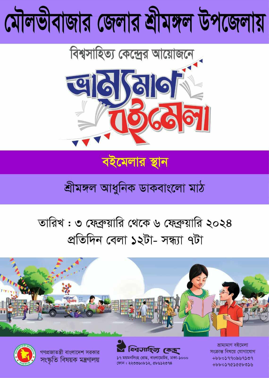শ্রীমঙ্গল উপজেলা প্রশাসনের সার্বিক সহযোগিতায় আগামীকাল ৩ ফেব্রুয়ারি থেকে ৬ ফেব্রুয়ারি ২০২৪ পর্যন্ত বিশ্বসাহিত্য কেন্দ্রের চারদিনব্যাপী বইমেলা'র আয়োজন করা হয়েছে।