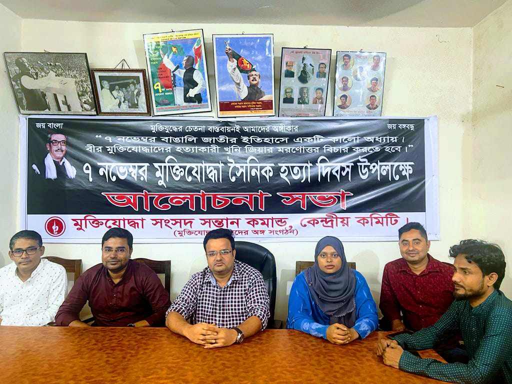 আলোচনা সভার বক্তব্যে সংগঠনের সভাপতি মাহবুবুল ইসলাম প্রিন্স বলেন, "শোকাবহ ৭ নভেম্বর মুক্তিযোদ্ধা সৈনিক হত্যা দিবস। তথাকথিত সিপাহী বিপ্লবের নামে ১৯৭৫ সালের এদিন থেকে পাকিস্তানের গুপ্তচর খুনী জিয়াউর রহমান বীর মুক্তিযোদ্ধা সেনা কর্মকর্তা ও সদস্যদের হত্যার ধারাবাহিক প্রক্রিয়া শুরু করেন। ১৯৭৫ সালের ৭ নভেম্বর তথাকথিত সিপাহী বিপ্লবের নামে প্রথমে হত্যা করা হয় তিন খ্যাতনামা বীর মুক্তিযোদ্ধাকে। বীর মুক্তিযোদ্ধা খালেদ মোশাররফ (বীর উত্তম), কে এন হুদা (বীর উত্তম) এবং এ টি এম হায়দার (বীর বিক্রম) কে বিনা বিচারে ঠাণ্ডা মাথায় হত্যা করে খুনী জিয়া। ৬ নভেম্বর ১৯৭৫ ভোর রাতে ৩ নভেম্বর অভ্যুত্থানে বন্দি জিয়াউর রহমানকে মুক্ত করতে যায় বঙ্গবন্ধুর খুনি ফারুকের ল্যান্সার বাহিনীর একটি দল। জাতির পিতা বঙ্গবন্ধু শেখ মুজিবুর রহমান ও তাঁর পরিবারের সদস্যদের হত্যার অন্যতম ঘাতক ল্যান্সার মহিউদ্দিন ছিলো এই দলের নেতৃত্বে। তারা খুনী জিয়াকে মুক্ত করে নিয়ে আসে খুনি কর্ণেল রশিদের দুই নম্বর অ্যাটিলারি রেজিমেন্টের দপ্তরে। জিয়ার নির্দেশেই দশম বেঙ্গল রেজিমেন্টের সদর দপ্তরে অবস্থানকালে বীর মুক্তিযোদ্ধা খালেদ, এন হুদা এবং এম হায়দারকে একেবারে কাছ থেকে গুলি করে হত্যা করে দুজন কোম্পানি কমান্ডার আসাদ এবং জলিল। খুনী জিয়া নিজেকে অবৈধভাবে সেনাপ্রধান ও ডেপুটি চিফ মার্শাল ল’ অ্যাডমিনিস্ট্রেটর ঘোষণা করে। একটি উচ্চ ক্ষমতাসম্পন্ন তদন্ত কমিটি গঠন করে খুনী জিয়ার মরণোত্তর বিচারের দাবি জানাচ্ছে মুক্তিযোদ্ধা সংসদ সন্তান কমাণ্ড।"