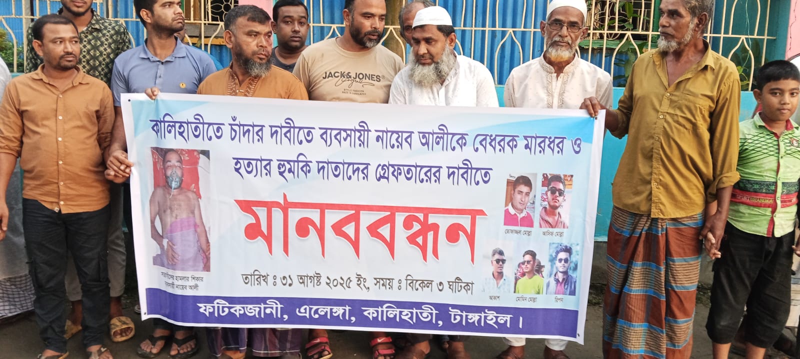 মোঃ আনিসুর রহমান শেলী : টাঙ্গাইলের কালিহাতী উপজেলার এলেঙ্গা পৌরসভার ৮ নং ওয়ার্ডের পোংলি ফটিকজানী গ্রামে সন্ত্রাসী হামলার প্রতিবাদ ও বিচারের দাবিতে এলাকাবাসীর উদ্যোগে মানববন্ধন অনুষ্ঠিত হয়েছে। রবিবার (৩১