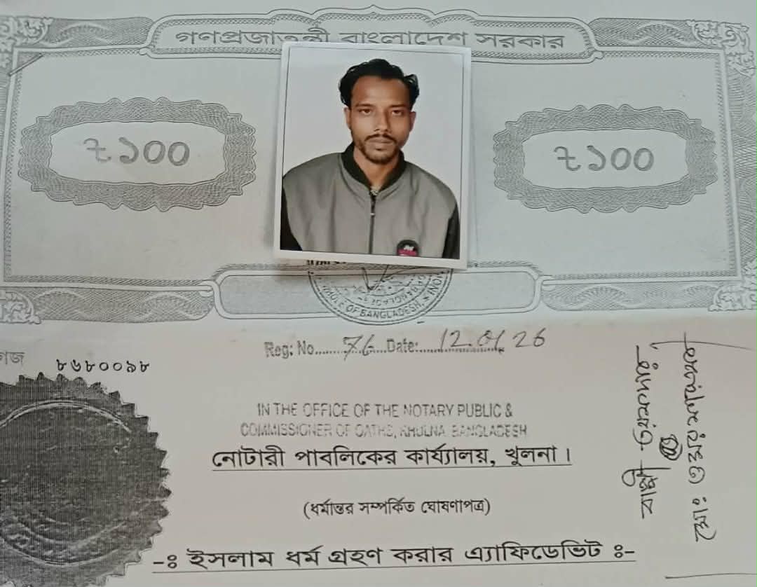 আঃ মান্নান (রূপসা প্রতিনিধি) : খুলনা জেলা জজ কোর্টে আজ ১২-ই জানুয়ারি হিন্দু ধর্ম থেকে ইসলাম ধর্ম গ্রহণ করেছেন বাপ্পী তরফদার নামে এক ব্যক্তি।তিনি সাতক্ষীরা জেলার কলারোয়া থানার
