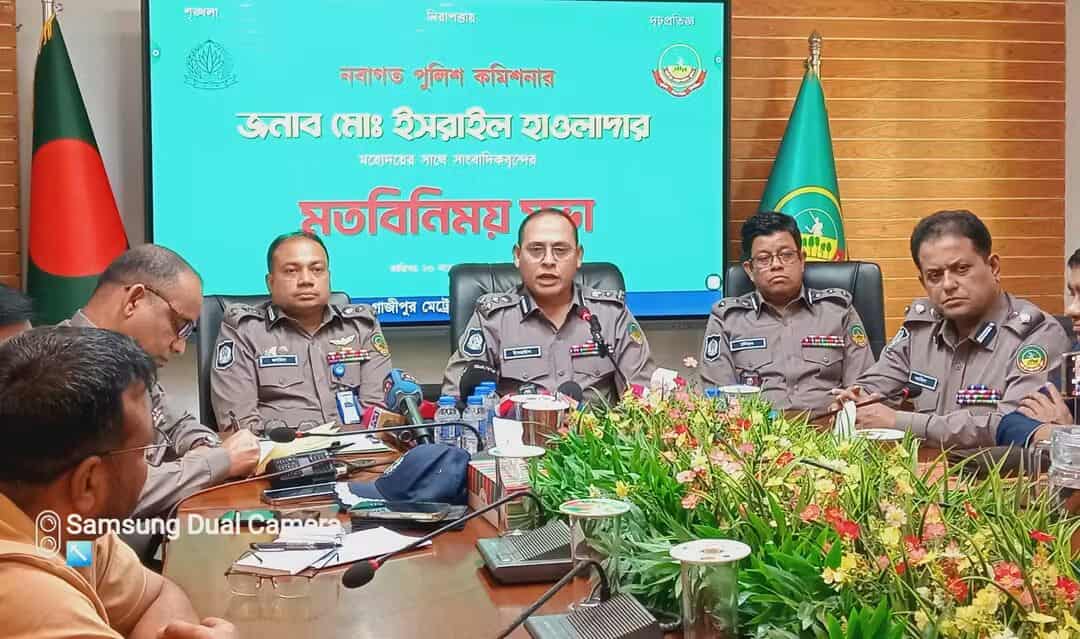 মোঃ হাইউল উদ্দিন খান, গাজীপুর প্রতিনিধি গাজীপুর মেট্রোপলিটন পুলিশের নবনিযুক্ত পুলিশ কমিশনার মো. ইসরাইল বলেছেন,গাজীপুরকে নিরাপদ, আধুনিক ও অপরাধমুক্ত নগরীতে রূপ দিতে চাই মাদক, অপরাধী চক্র, অবৈধ পার্কিং, বস্তিতে মাদকের