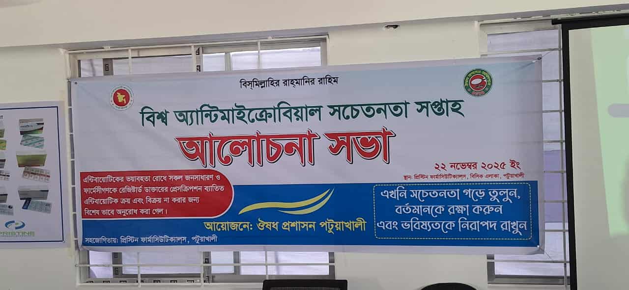 মোঃগোলাম রাব্বী,স্টাফ রিপোর্টার:- পটুয়াখালী জেলা ঔষধ প্রশাসন অধিদপ্তরের আয়োজনে এবং প্রিস্টিন ফার্মাসিউটিক্যালস এর সহযোগিতায় বিশ্ব অ্যান্টিমাইক্রোবিয়াল রেজিস্ট্যান্স সচেতনতা সপ্তাহ উপলক্ষে র্যালি ও সেমিনারের আয়োজন করা হয়েছে। শনিবার