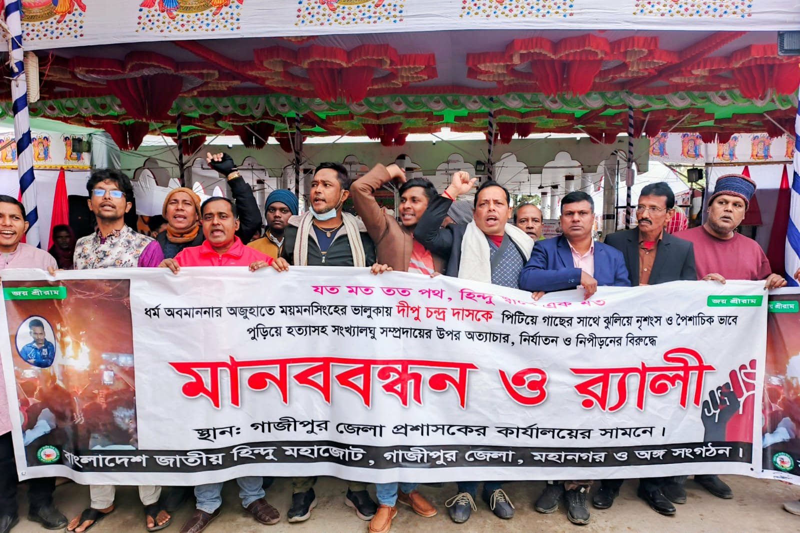 মানববন্ধন ও রেলি আজ গাজীপুর জেলা ও মহানগর বাংলাদেশ হিন্দু মহাজোট এর আয়োজনে ধর্ম অবমাননার অজুহাতে ময়মনসিংহের ভালুকায় দিপু চন্দ্র দাস কে পিটিয়ে গাছের সাথে জুলিয়ে নিসংস ও পৈশাচিক