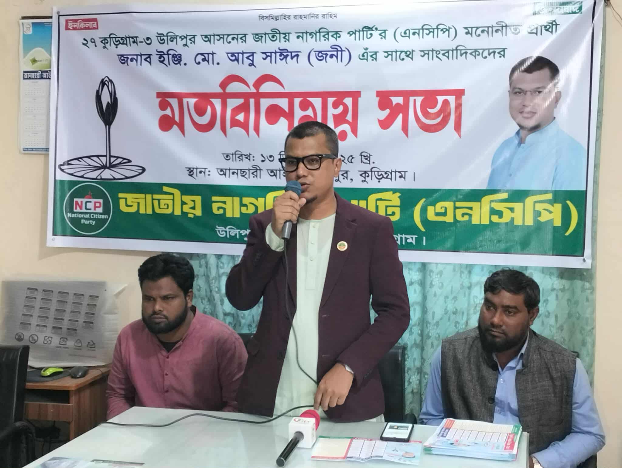 উলিপুর (কুড়িগ্রাম) প্রতিনিধি: কুড়িগ্রাম-৩ (উলিপুর) আসনে জাতীয় নাগরিক পার্টি (এনসিপি) মনোনীত প্রার্থী ইঞ্জিনিয়ার মো. আবু সাঈদ (জনি)-এর সঙ্গে স্থানীয় সাংবাদিকদের মতবিনিময় সভা অনুষ্ঠিত হয়েছে। শনিবার (১৩
