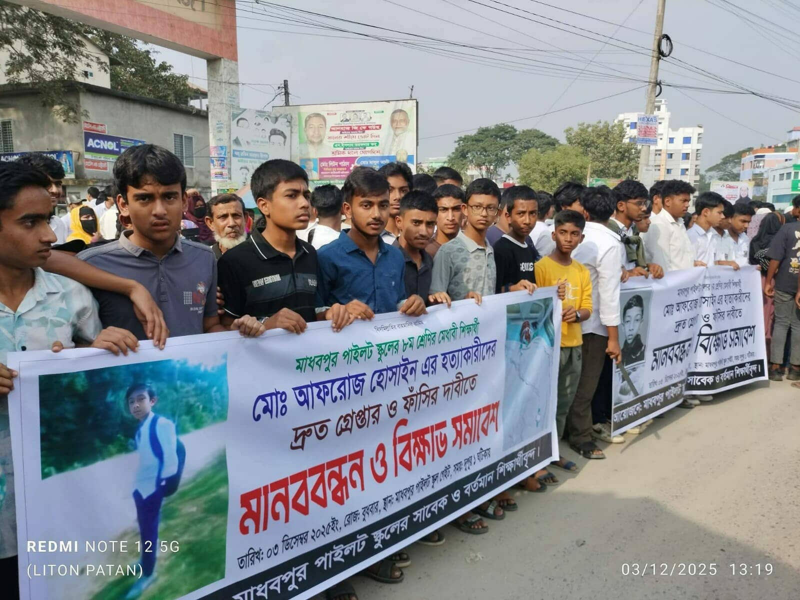 স্টাফ রিপোর্টার : নির্মল ইন্দু সরকার হবিগঞ্জের মাধবপুর উপজেলার মাধবপুর পাইলট উচ্চ বিদ্যালয়ের অষ্টম শ্রেণির মেধাবী ছাত্র মোঃ আফরোজ হোসেনের হত্যাকারীদের দ্রুত গ্রেফতার করে ফাঁসির দাবিতে বুধবার (৩-ডিসেম্বর)মানববন্ধন
