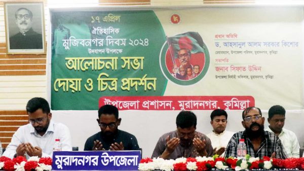 সাখাওয়াত হোসেন (তুহিন) মুরাদনগর কুমিল্লা প্রতিনিধি: কুমিল্লার মুরাদনগরে যথাযােগ্য মর্যাদায় ১৭ এপ্রিল ঐতিহাসিক মুজিবনগর দিবস পালন করা হয়ছে। দিবসটি উপলক্ষ্যে উপজেলা প্রশাসন কর্তৃক আলােচনা সভা, দোয়া, চিত্র প্রদর্শণ ও