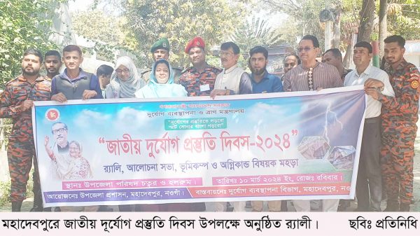 নওগাঁ প্রতিনিধি: এস এ উজ্জ্বল, ‘দুর্যোগের প্রস্তুতিতে লড়বো, স্মার্ট সোনার বাংলা গড়বো’ এই প্রতিপাদ্যকে সামনে রেখে নওগাঁর মহাদেবপুরে জাতীয় দুর্যোগ প্রস্তুতি দিবস উদযাপন করা হয়েছে। উপজেলা প্রশাসনের আয়োজনে ও