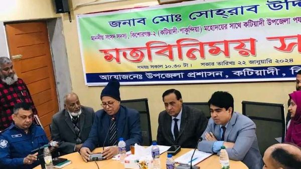 মোঃ মোফাসসেল সরকার,স্টাফ রিপোর্টার, কিশোরগঞ্জ -২ (কটিয়াদী-পাকুন্দিয়া)আসনের নব নির্বাচিত সংসদ সদস্য অ্যাডভোকেট সোহরাব উদ্দিন-এর সঙ্গে কটিয়াদী উপজেলা প্রশাসনের আয়োজনে বিভিন্ন দপ্তর প্রধান ও জন প্রতিনিধির সাথে মতবিনিময় সভা অনুষ্ঠিত