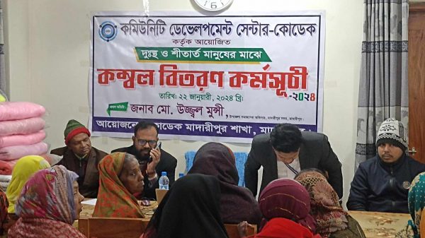 মাদারীপুর প্রতিনিধিঃ মোঃ বেলায়েত হোসেন। কমিউনিটি ডেভেলপমেন্ট সেন্টার- কোডেক মাদারীপুর জেলা শাখার উদ্যোগে দুঃস্থ ও শীতার্ত ২ শতাধিক মানুষের মাঝে কম্বল বিতরণ করা হয়েছে। সোমবার সকালে মাদারীপুর