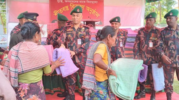 বিশেষ প্রতিনিধিঃ বান্দরবান আলীকদমে ৯ম প্রতিষ্ঠা বার্ষিকী উদযাপন উপলক্ষে স্থানীয় অসহায় ও দুস্থ পরিবারের মাঝে শীতবস্ত্র বিতরণ করছে আলীকদম ব্যাটালিয়ন (৫৭ বিজিবি)। ২৪ ডিসেম্বর ২০২৩ রবিবার দুপুর ১২ঘটিকায় ব্যাটালিয়ন