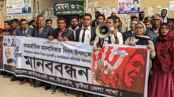 কুষ্টিয়া প্রতিনিধি: আন্তর্জাতিক মানবাধিকার দিবস উপলক্ষে কুষ্টিয়ায় মানববন্ধন করেছে জাতীয়তাবাদী দল বিএনপির নেতাকর্মীরা। রোববার (১০ডিসেম্বর) দুপুরে কুষ্টিয়ার আদালত চত্বরে জেলা বিএনপি ও অঙ্গ সহযোগী সংগঠনের বিভিন্ন ব্যানারে এ মানববন্ধন