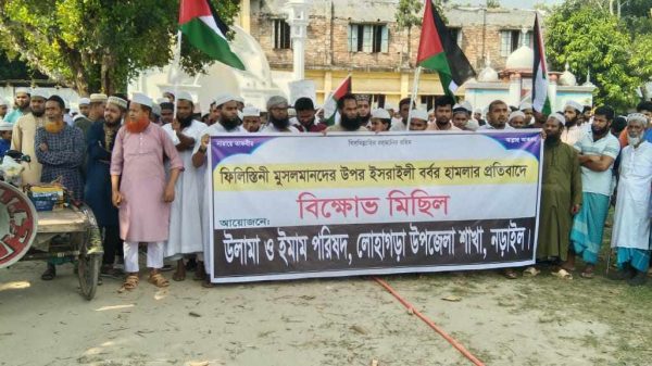 স্টাফ রিপোর্টার: নড়াইলের লোহাগড়ায় ফিলিস্তিনী মুসলমানদের উপর ইসরাইলী বর্বরোচিত হামলার প্রতিবাদে বিক্ষোভ মিছিল ও সমাবেশ অনুষ্ঠিত হয়েছে। সোমবার (১৬ অক্টোবর) সকাল ১১টার দিকে লোহাগড়া উপজেলা উলামা ও