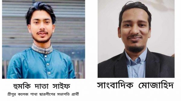 গাজীপুরের শ্রীপুর পৌর এলাকায় জমি সংক্রান্ত একটি ভিডিও প্রতিবেদন প্রকাশের জেরে “দৈনিক গণতদন্ত” পত্রিকার নিজস্ব প্রতিবেদককে শ্রীপুর মুক্তিযোদ্ধা রহমত আলী কলেজ শাখা ছাত্রলীগের সভাপতি পদপ্রার্থী পরিচয়ধারী মুঠোফোনের মাধ্যমে প্রাণনাশের