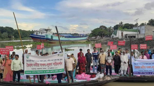 মোঃ কামাল হোসেন,অভয়নগর প্রতিনিধিঃ যশোরের অভয়নগরে ভৈরব নদীর দখল-দূর্ষণ বন্ধে নৌকায় মানববন্ধন হয়েছে। ভবদহ পানি নিষ্কাশন ও কৃষি জমি রক্ষা জোটের আয়োজনে মঙ্গলবার (১১ অক্টোবর) বিকালে উপজেলার নওয়াপাড়া-শংকরপাশা খেয়াঘাটে এ