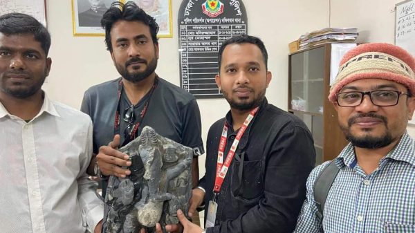 স্টাফ রিপোর্টার : মোঃ সোহেল রানা । রাজধানী দক্ষিণ খান এলাকার মধ্য গাওয়াইর থেকে গতকাল রাত ১২টায় সাংবাদিকদের সহায়তায় ২০ কেজি ওজনের কষ্টিপাথরের খন্ডিত মূর্তি উদ্ধার করা হয়।
