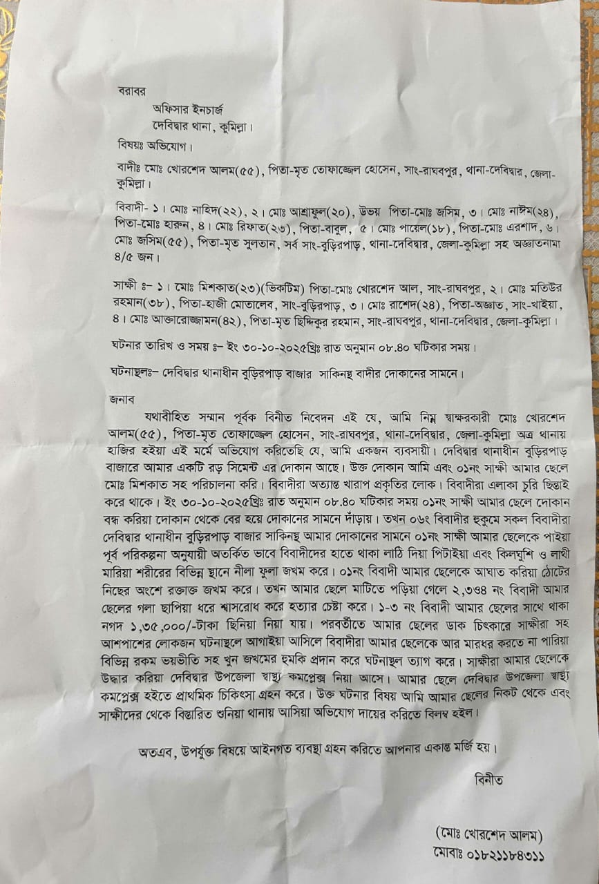 দেবিদ্বার (কুমিল্লা) প্রতিনিধি : কুমিল্লার দেবিদ্বারে এক ব্যবসায়ীর ছেলেকে পিটিয়ে হত্যার চেষ্টা ও নগদ ১ লাখ ৩৫ হাজার টাকা ছিনিয়ে নেওয়ার অভিযোগ উঠেছে। এ ঘটনায় আহত মিশকাতকে দেবিদ্বার উপজেলা