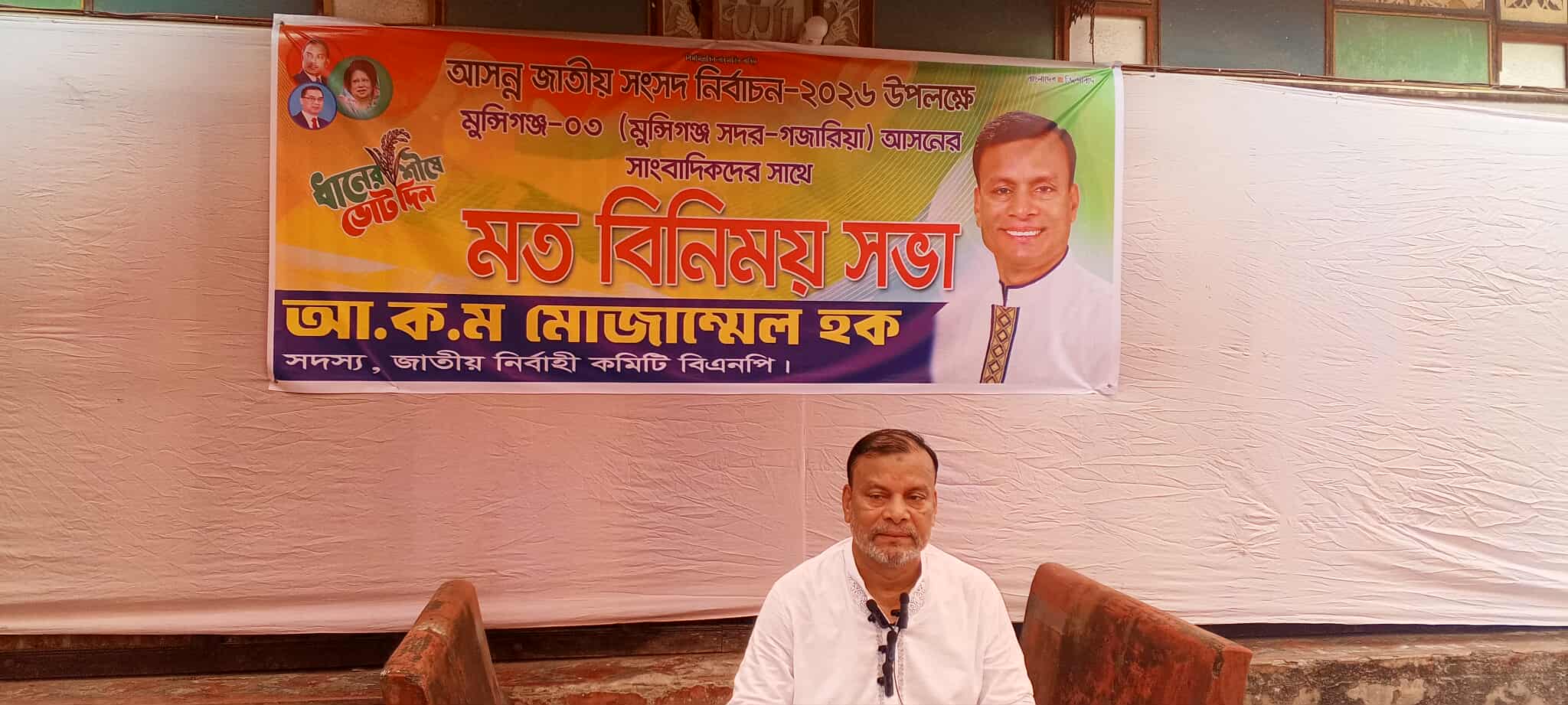 ওসমান গনি স্টাফ রিপোর্টার মুন্সীগঞ্জে গজারিয়া উপজেলা আসন্ন জাতীয় সংসদ নির্বাচন ২০২৬ইং উপলক্ষ্যে মুন্সীগঞ্জ-৩(সদর-গজারিয়া) আসনে মনোনয়ন প্রত্যাশী বিএনপি’র জাতীয় নির্বাহী কমিটির সদস্য আ,ক,ম মোজাম্মেল হক মত বিনিময় করেছেন স্থানীয় সাংবাদিকদের