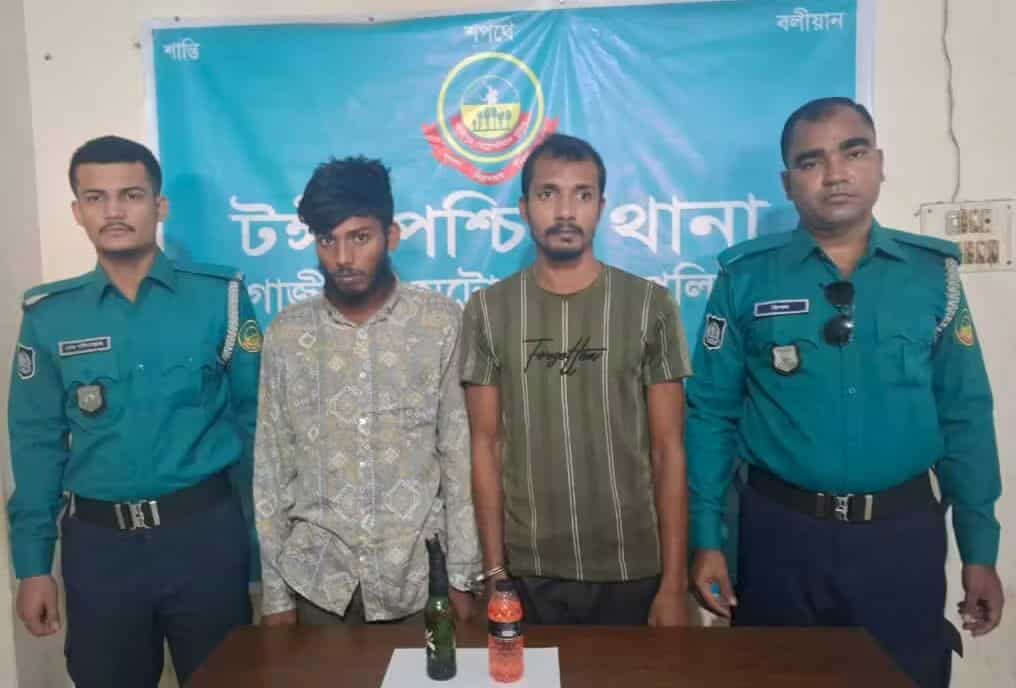 মোঃ হাইউল উদ্দিন খান,গাজীপুর প্রতিনিধি গাজীপুর মেট্রোপলিটন পুলিশের টঙ্গী পশ্চিম থানা এলাকা থেকে পেট্রোল বোমা বহনের অভিযোগে দুই যুবককে আটকের পর গ্রেপ্তার দেখানো হয়েছে। শনিবার (১৫